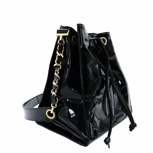 CHANEL Chain Shoulder Bag Drawstring Pouch Patent Leather Black Leather Coco Logo Black Gold Hardware 7-10-999