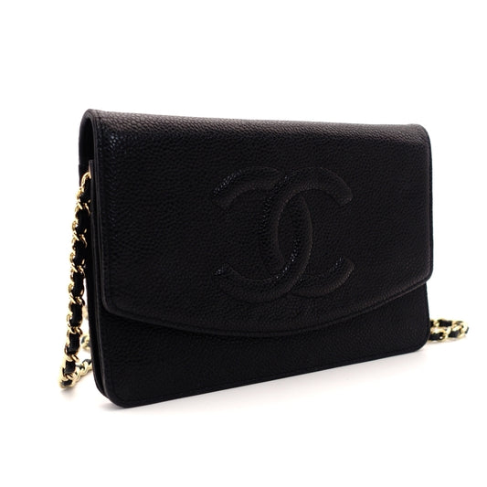 CHANEL Caviar Skin Chain Wallet Leather Black WOC Gold Hardware Black 7-5-323