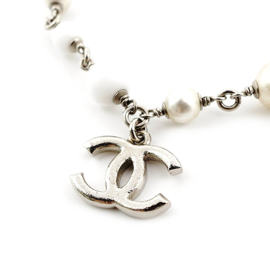 CHANEL Bracelet Silver × White CC Logo Faux Pearl 7-7-1100