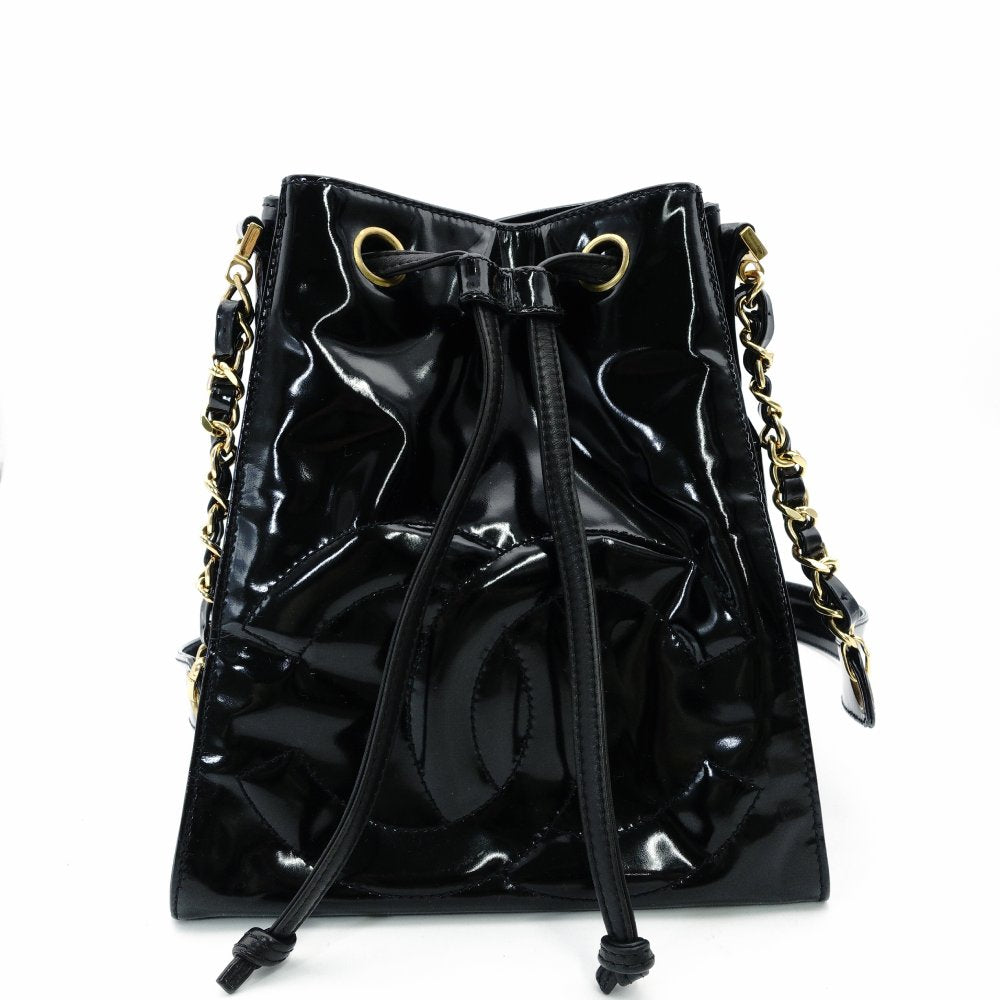 CHANEL Chain Shoulder Bag Drawstring Pouch Patent Leather Black Leather Coco Logo Black Gold Hardware 7-10-999